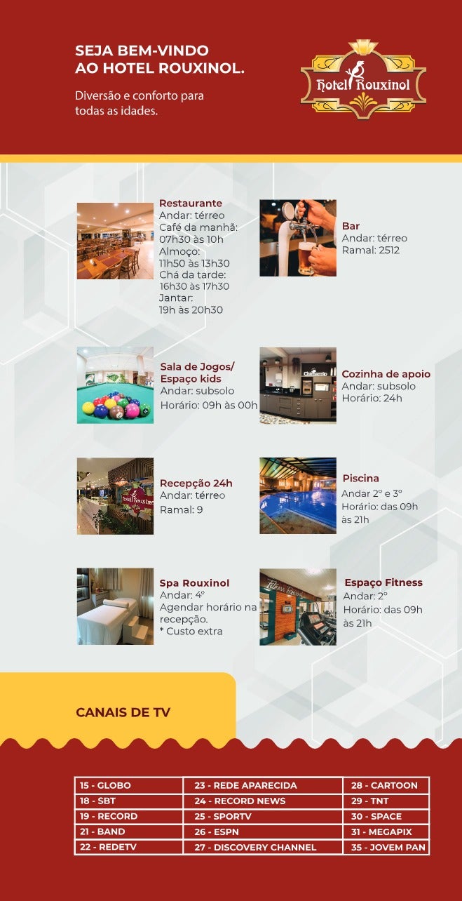 | Uma criança menor de 5 anos é cortesia. Crianças de 6 a 12 anos ou segundo filho mesmo que menor de 5 anos R$220,00 em diárias durante a semana ou R$270,00 em diárias de fim de semana. Com 13 anos ou mais consideramos tarifa de adulto. | ||