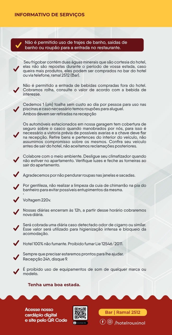 | Uma criança menor de 5 anos é cortesia. Crianças de 6 a 12 anos ou segundo filho mesmo que menor de 5 anos R$270,00 em diárias durante a semana ou R$340,00 em diárias de fim de semana. Com 13 anos ou mais consideramos tarifa de adulto. | |